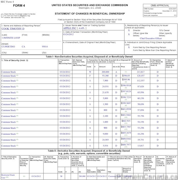 Pracovat pro společnost Apple je snem mnoha našich čtenářů. Většina z nich za touto prací vidí spíše možnosti dostat se k technologickým novinkám jako první na světě a stanout v čele revolučních produktů. Na druhou stranu se jedná o nesmírně dobře placenou práci. Steve Jobs byl známý tím, že vždy uměl své zaměstnance skvěle ohodnotit a dokázal se jim odvděčit za přínos společnosti. Steve Jobs spolu s valnou hromadou Apple Inc. v průběhu uplynulých let udělovalo zaměstnancům na vrcholných postech společnosti odměnu v podobě akcií společnosti. Akcie sebou nesly podmínku, že je může každý zaměstnanec obchodovat až po určitém čase. Vedení Apple tak bylo motivováno, aby dosahovalo co nejlepších výsledků a hodnota jejich akcií stoupala. Na začátku roku skončila výše uvedená podmínka pro několik stovek tisíc akcií, které obdržel Tim Cook, Philip Schiller, Peter Openheimer, Robert Mansfield a Scott Forstall. Pánové tak vzhledem k výhodné hodnotě akcií na nic nečekali a rozhodli se cenné papíry proměnit na skutečný majetek. Celkově se dne 24. 3. 2012 zasloužilo pět vrcholných manažerů společnosti Apple Inc. o prodej akcií v hodnotě 314 677 763$.