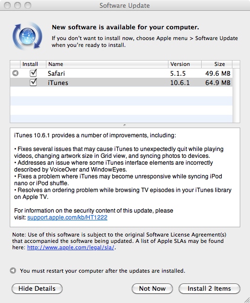 Apple vydal novou verzi multimediálního přehrávače iTunes, tentokrát ve verzi iTunes 10.6.1, která řeší řadu chyb. Novou verzi iTunes si můžete stáhnout pomocí služby Software Update nebo přímo zde. iTunes 10.6.1 řeší konkrétně následující problémy.
