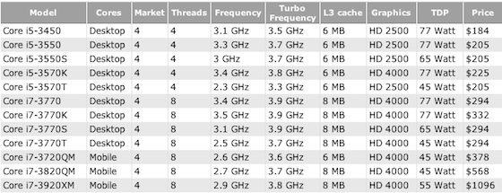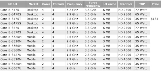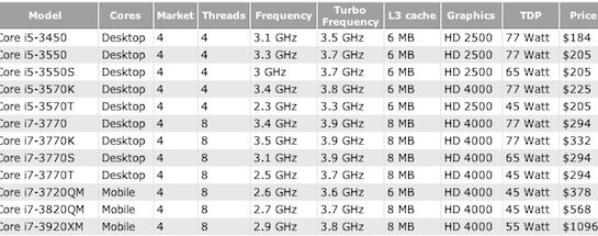 Približne pred mesiacom sme informovali, že začiatok predaja nových procesorov od Intelu postavených na architektúre Ivy Bridge, sa pre veľké skladové zásoby starších čipov o pár mesiacov oneskorí. Tým pádom sa očakávalo aj meškanie novej generácie modelov rady Mac, ktoré majú uvedené procesory obsahovať. Podľa posledných správ na serveri CPU World, sa Intel rozhodol uviesť spomenutú architektúru vyrobenú 22nm procesom oveľa skôr, presnejšie 29. apríla tohto roku. Osobne vzhľadom na uvedené informácie predpokladám, že predstavenie novej generácie OS X zariadení môžeme očakávať už na koniec apríla, prípadne začiatok mája. Na tento dátum sú však naplánované len niektoré verzie Intel Ivy Bridge, ktoré sú konkrétne vypísané v nasledujúcej tabuľke: