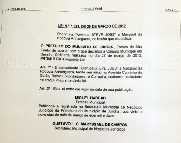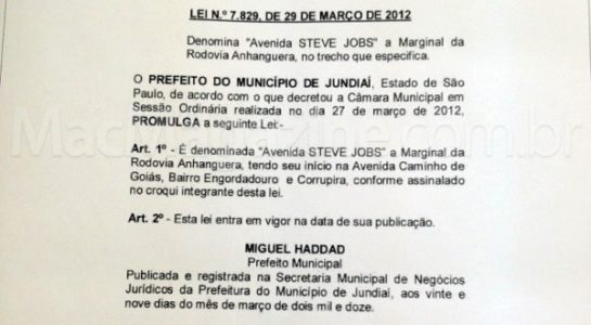 Brazilské město Jundiai navrhlo pojmenování jedné ze svých ulic jako Steve Jobs Avenue již den po smrti zakladatele společnosti Apple Computers. Městská rada však až nyní schválila přejmenování dané ulice, která se bude oficiálně jmenovat Avenida STEVE JOBS, což znamená ulice Steva Jobse. Pokud se chcete projít po Stevu Jobsovi, máte možnost, stačí jen vyrazit do Brazilského města Jundiai.