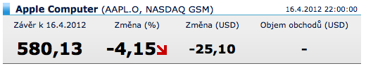 Akcie americké společnosti Apple během včerejšího dne zaznamenaly největší propad od 19. října 2011 a jejich hodnota nakonec uzavřela na 580$ za kus. Akcie tak dosáhly propadu o více než 4%. Příčiny propadu akcií společnosti Apple lze hledat hned ve dvou různých zprávách, které včera obletěly analytický svět. První informací, která srazila akcie Apple, byla zpráva amerického mobilního operátora Verizon Wireless, která informovala o tom, že bude společnost nově účtovat částku 30$ každému zákazníkovi, který bude chtít přejít na novější verzi mobilního telefonu Apple iPhone.