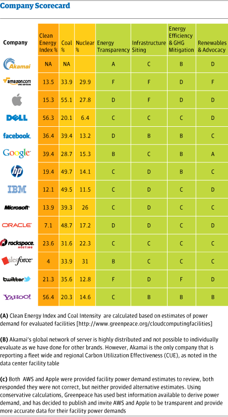 Zástupci Greanpeace zveřejnili tabulku, ve které ukazují využití jednotlivých zdrojů energie k pohonu serverových farem jednotlivých společností. Bohužel z této tabulky jako jedna z nejhorších společností vyšla právě společnost Apple. V doprovodném dokumentu se dále uvádí, že iCloud je značně poháněn špinavou energií, zejména energií vznikající spalováním uhlí, které pochází z nalezišť v pohoří Appalachia. Gary Cook, autor zprávy dále uvádí, že právě využití takto staromódní energie není zrovna to, co bychom očekávali od společnosti jako je Apple, která je na vrcholu technologického žebříčku.