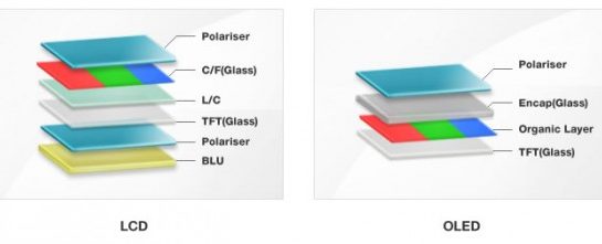 *LCD displej se v současné době skládá z šesti vrstev, OLED displej pak tvoří 4 vrstvy.