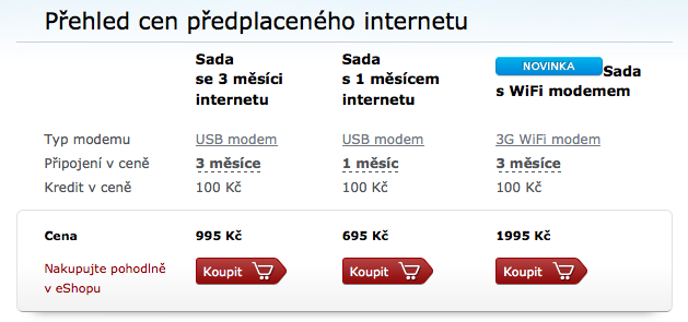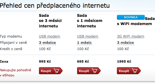 Operátor O2 nabízí stadnardně za cenu 300Kč měsíční FUP limit 500MB. Pokud však využijete balíček s názvem Předplacená sada mobilního internetu, získáte za 300Kč měsíčně FUP limit 3000MB. Součástí balíčku je totiž kromě 3 měsíců předplaceného internetu a 7 dní zdarma také kredit v hodnotě 100Kč, který můžete využít na zaplacení další tří dnů internetu ve vašem iPadu. Balíček je standarndně určen pro notebooky, proto je také dodávaný s modemem pro USB v ceně. Ovšem pokud si vystřihnete ze SIM karty micro Sim kartu, není problém jej používat v iPadu 3G + Wi-Fi. Modem můžete navíc zkusit prodat na některém za ukčních portálů a při troše štěstí tak ještě nějakou tu korunu ušetříte. Bohužel budete muset SIM kartu opravdu stříhat, protože při objednávce samostatné Micro SIM karty nezískáte předplacený internet.