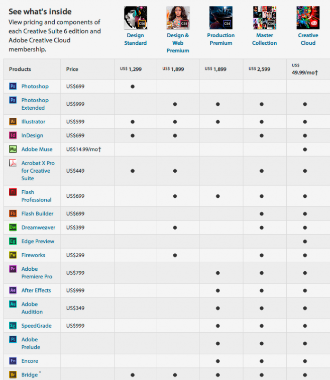 Nové verzie programov ako Photoshop®, InDesign®, lllustrator®, Dreamweaver®, Adobe Premiere® Pro, After Effects® alebo Flash® Professional budú novým záujemcom dodané do 30 dní. Konkrétne ceny týchto profesionálnych programov a ich balíčkov, si môžete prezrieť v nasledujúcej tabuľke: