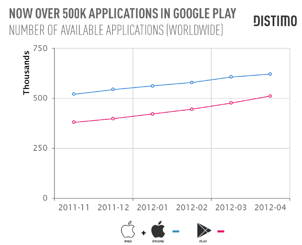 Analytická společnost Distimo zveřejnila přehled růstu aplikací v iTunes App Store a Google Play. V současné době překročil počet aplikací v iTunes App Store 620 000 a v Google Play 510 000 aplikací. Je zajímavé, že zatím co iTunes App Store pomalu ale jistě snižuje počet nových aplikací, které denně přibývají, Googlu začal v posledním období naopak přísun aplikací stoupat. Na druhou stranu je skutečnost, že vývojářům Applu v poslední době již dochází možnosti, jak vytvořit skutečně originální aplikaci. Počet API je totiž ze strany Apple omezen a přee jen vše co mělo smysl vytvořit je na iTunes App Store již v mnoha tisících verzí. Ovšem v Google je zase pro změnu velké množství nekvalitních aplikací, které jsou zde jen díky tomu, že Google neschvaluje pro Play aplikace, ale je možné přidat prakticky jakoukoli aplikaci.