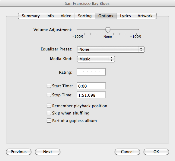 Pro změnu Equalizeru stačí vybrat danou skladbu nebo album a zvolit položku Get Info, kterou najdete v menu po stiskuntí pravého tlačítky. Následně vyberte záložku Options a zvolte Equalizer Preset. V nabídce vyberte požadované nastavení a stiskněte ok. Skladbě nebo albu je nyní na pevno nastaven daný equalizér, který se bude používat při jejím přehrávání v jakémkoli zařízení, které tuto možnost podporuje, tedy minimálně ve všech zařízení s iOS nebo iTunes. Na konec nezbývá než dodat, že použitím Equalizéru defakto degradujete snahu umělců a nahrávacích studií, které se snaží poskytnout vám zvuk přesně tak, jak jej hudebník nahrál a vytvořil. Poslech přesně podle představ umělců si tak poslechnete pouze s vypnutým equalizérem.