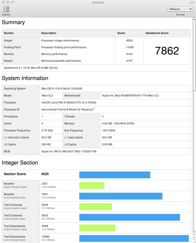 Na následujícím obrázku vidíte Geekbench test iMac 2011 s procesorem Intel Quad-core Sandy-Bridge i5 na 2.7Ghz, 4GB DDR3 operační paměti na frekvenci 1333Mhz, grafickou kartou AMD Radeon HD 6770M s 512MB grafické paměti GDDR5 a 1TB pevným diskem s 7200 otáčkami za minutu. Test byl proveden po restartu systému Mac OS X 10.6.7 Snow Leopard a v jeho průběhu nebyla spuštěna žádná jiná aplikace. Test byl proveden celkem 5x a byl vybrán průměrný výsledek, výsledky testu se lišily v řádu jednotek bodů.