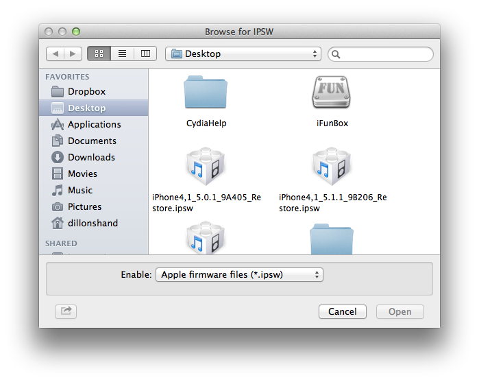 3. Klikněte na „Restore“ a pak „IPSW“ a vyberte si jako první iOS 5.0.1 firmware na vašem počítači. Když se objeví výzva, zvolte aktuální firmware, který používáte, tedy iOS 5.1 nebo iOS 5.1.
