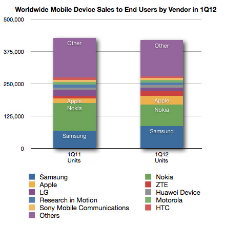 Apple dokázal obsadit 7,9% z celkově 419,1 milionu mobilních telefonů, které se v prvním čtvrtletí roku 2012 prodalo. Zajímavostí také je, že zatím co celosvětový prodej mobilních telefonů meziročně v porovnání s prvním čtvrtletí loňského roku klesl o 2%, Apple dokázal za stejnou dobu své prodeje zdvojnásobit a z 3,8%, které na celosvětovém trhu mobilních telefonů zaujímal v loňském roce se dostal až na 7,9%. Prodej smartphone však meziročně stoupl o 44,7% na 144,4 milionů kusů. Apple je schopen konkurovat celému mobilnímu trhu pouze se třemi verzemi iPhone, které se aktuálně prodávají a to navíc s tím, že o iPhone 3Gs již v současné době není příliš velký zájem a prodává se navíc pouze v USA.