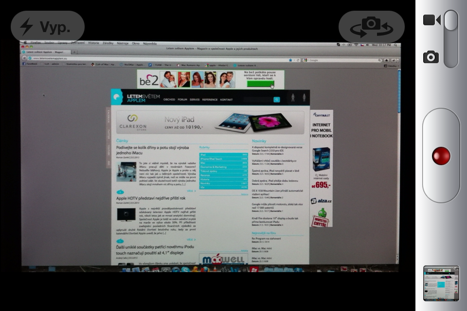 Ovšem u Apple jsme vždy zvyklí na nějakou tu vychytávku, ne jinak tomu je i v tomto případě. iOS totiž umožňuje během natáčení videa poklepáním na plochu displeje zobrazit v hledáčku plnou velikosti toho co natáčíte. Stačí se dvakrát za sebou klepnout na displej a zobrazí se vše co bude ve výsledném videu. Díky této možnosti tedy zobrazíte skutečně 100% toho co natáčíte, obraz se méně klepe a navíc je ostřejší. Zpět na normální zobrazení se přepnete dalším dvojitým klepnutím na display.