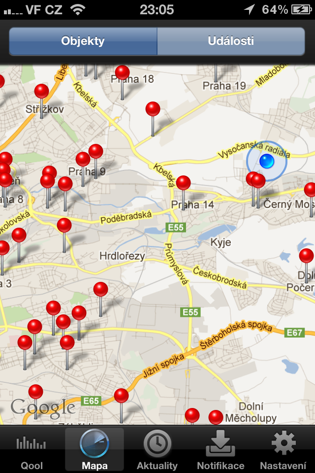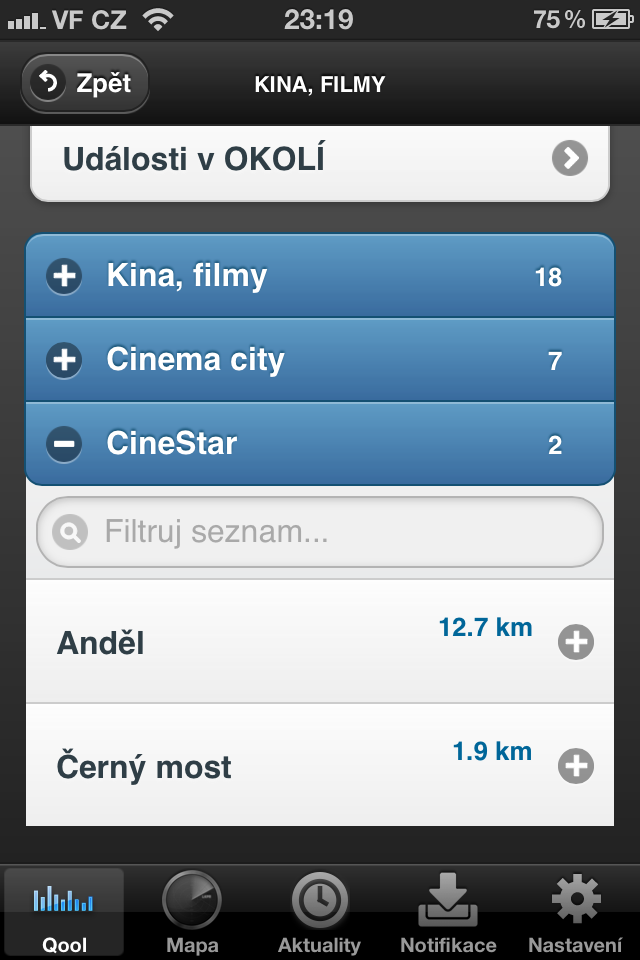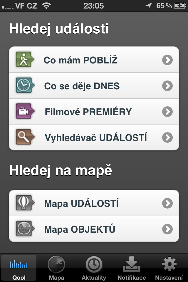 Jak jsem již psal výše celá aplikace je jednoduchá a po vizuální stránce i velmi skvěle povedená. Uživatelské rozhraní je rozvrženo zcela logicky a umožňuje přístup ke všem možnostem co tato app nabízí. Nejdůležitějším prvkem v rozhraní je spodní lišta s celkově pěti záložkami-Qool, Mapa, Aktuality, Notifikace a Nastavení, přičemž nejvíce používanou bude záložka Qool, díky které můžete vyhledat vám nejbližší události (na základě vaší GPS lokace), filmové premiéry v kinech a denní události. Zároveň můžete vyhledat události a určité objekty (kluby, kina, divadla, muzea, hrady, zámky aj.) a to buď pomocí mapy a nebo pomocí vyhledávače. Vedlejší záložka Mapa, zcela logicky zobrazí na mapě právě probíhající události či zobrazí objekty v databází aplikace, následující záložka-Aktuality zobrazí seznam akcí, které proběhnou v nejbližší době. Díky tomu tak zjistíte s určitým časovým předstihem co se bude dít. Ještě jenom upozorním, že k tomu, aby jste aplikaci mohli naplno využít je vhodné mít mobilní internet ve svém iZařízení, jelikož aplikace si veškerá data stahuje ze sítě.