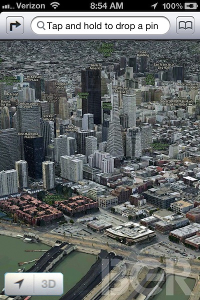 Vytratiť by sa mala modrá farbená schéma, ktorá bude po vzore iPadu nahradená striebornou farbou. Najviditeľnejšou a najočakávanejšou novinkou však bude podpora 3D zobrazenia máp, založená na technológii C3 Apple Technologies. Aktivácia 3D režimu bude prebiehať kliknutím na ikonu v ľavom dolnom hore, čo si je možné všimnúť aj na nasledujúcich screenshotoch.