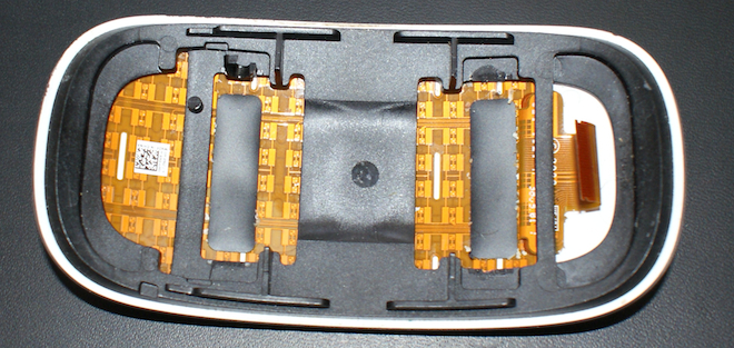 Právě oranžová část, kterou vidíte na fotografii je důvod, proč Apple pojmenoval svoji novou myš jako Magic Mouse. Jedná se o kapacitní dotykové senzory, které umožňují snímat doteky prstů. Oficiálně umožňuje Magic Mouse provádět gesta pouze dvěma prsty současně. Se speciální utilitou však není problém využít ani pět prstů najednou k vytvoření gest. Kapacitní senzory jsou připojeny k speciální plastové vrstvě, která funguje jako vodič, jenž propojí konečky vašich prstů s kapacitním senzorem. Jakmile dojde k propojení, elektrický impul okamžitě detekuje pohyb a pomocí plochého kabelu v zadní části Magic Mouse vyšle signál ze senzoru do čipu, který je zodpovědný za jeho zpracování. Senzory jsou k plastu přilepeny a zajímavostí je, že bílý plast je průsvitný. V budoucnu, až to bude výdrž baterií dovolovat, tedy nebude pro Apple problém, aby vytvořil svítící Magic Mouse. Na kapacitních senzorech se nachází nálepka s QR kódem, který však nebyl v žádné aplikaci rozpoznán. Patrně se jedná pouze o označení Magic Mouse nebo jejího dílu s kapacitními senzory, které slouží k interním účelům výrobce.