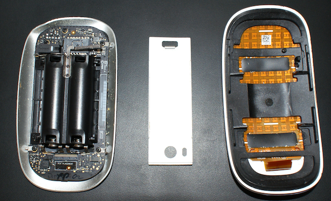 Pokud jste někdy viděli rozebranou běžnou počítačovou myš, musíte sami uznat, že Magic Mouse je opravdu co se součástek týká opravdu jinde než běžné myši. Celková váha Magic Mouse je 37 gramů, váha dvojice AA baterii je pak 47 hramů. Z celkové váhy 37 gramů tvoří pouze 10 gramů hliník. O zbytek váhy se stará plast a čipy na tištěném spoji. Magic Mouse je vyrobena velmi kvalitně, ovšem nenajdete v ní nic překvapivého, co by se nějak výrazně vymykalo od toho, jak si myslíte, že Magic Mouse ve vnitř vypadá.