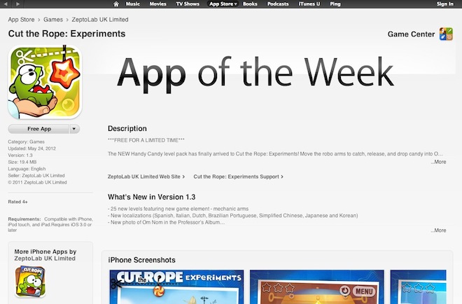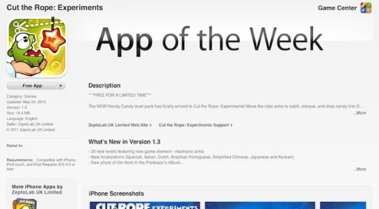Apple zavedl do iTunes App Store novou kategorii, Free App of the Week. Tato kategorie přinese každý týden jednu placenou aplikaci zcela zdarma. Bude se tedy jednat o kvalitní placenou hru nebo aplikaci, která bude vybrána jako Free App of the Week a po tento týden bude dostupná všem uživatelům zdarma. První aplikací byla hra Cut the Rope: Experiment. Druhou pak aplikace Snapseed, jenž běžně stojí 5$. Původní kategorii App of the week Apple přejmenoval na Editor’s Choice. V nově pojmenované kategorii budou i nadále aplikace, které vyberou přímo zástupci Apple, budou však placené.