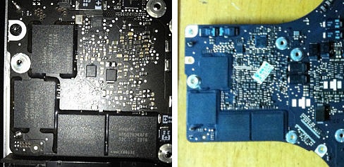 *Základní deska nového MacBook Pro i6 2012 s grafickým čipemNVIDIA GeForce GT 650 (vlevo) a základní deska současného MacBook Pro (vpravo).