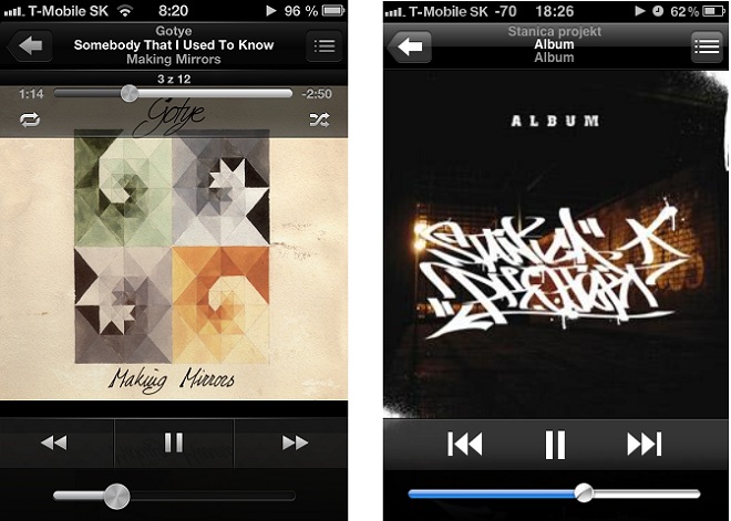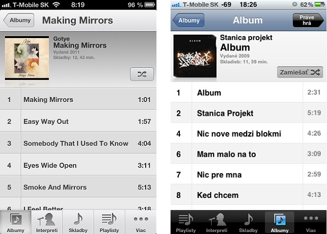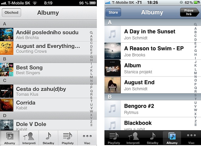 - Aplikácia Hudba (vľavo iOS 6, vpravo iOS 5.1.1)