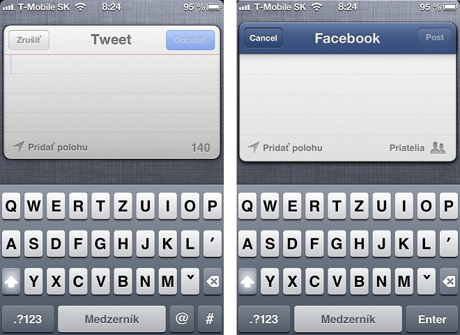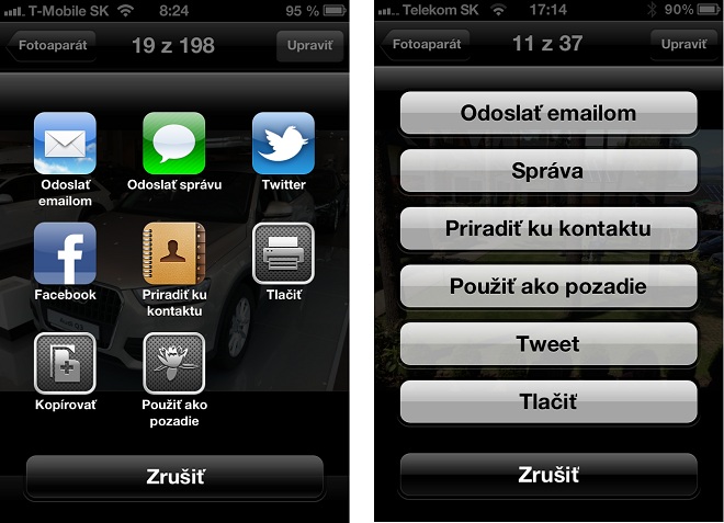 - Možnosti zdieľania (vľavo iOS 6, vpravo iOS 5.1.1)