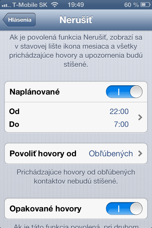 Nová funkcia Nerušiť, umožňuje stíšiť všetky prichádzajúce hovory a upozornenia. Taktiež je možné aj jej presné načasovanie od a do určitej hodiny, alebo konkrétne určenie osôb, na ktorých hovor má byť upozornené.