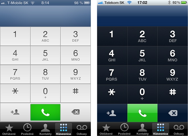 - Klávesnica na vytáčanie čísla (vľavo iOS 6, vpravo iOS 5.1.1)