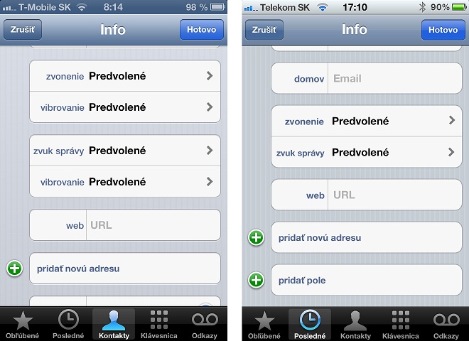 - Úprava kontaktov (vľavo iOS 6, vpravo iOS 5.1.1)