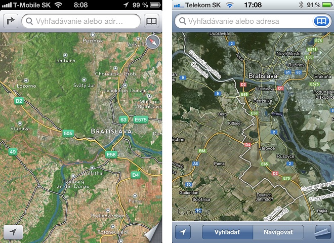 - Aplikácia Mapy (vľavo iOS 6, vpravo iOS 5.1.1)