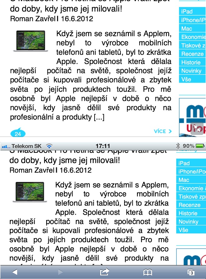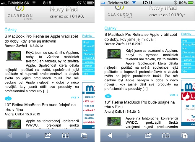 - Aplikácia Safari (vľavo iOS 6, vpravo iOS 5.1.1)