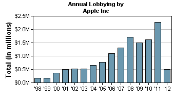 Vidíme, že Apple v roce 2012 vydal zatím pouze 500 tis. dolarů. Minulý rok utratila společnost za lobbistické aktivity téměř 2,5 milionů dolarů, což by se mohlo jevit jako vysoká částka, avšak pouze do chvíle, kdy jí porovnáme s výsledky konkurentů.