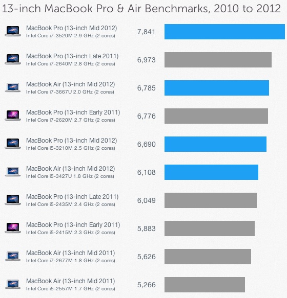 Konkrétne typy procesorov, ktoré obsahujú nedávno predstavené 13“ modely, sú najvýkonnejší Intel Core i7-3520M 2.9Ghz (2-jadrový), Intel Core i7-3667U 2.0Ghz (2-jadrový), Intel Core i5-3210M 2.5Ghz (2-jadrový) a najslabší Intel Core i5-3427U 1.8Ghz (2-jadrový). Benchmarkové porovnanie novej generácie MacBookov so staršou je znázornené na nasledujúcej tabuľke, v ktorej je celkové skóre jasným dôkazom väčšieho výpočtového výkonu najnovšej architektúry Ivy Bridge.