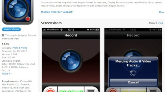 Pokiaľ ste niekedy potrebovali natočiť obrazovku vášho iOS zariadenia, boli ste nútený spraviť jailbreak, ktorý vám prostredníctvom Cydie umožnil stiahnuť konkrétnu aplikáciu podporujúcu takúto funkciu. Avšak to je už minulosťou, pretože spoločnosť Apple pre pár dňami schválila do svojho internetového obchodu s aplikáciami App Store, populárnu utilitu s názvom Display Recorder. Disponuje rovnakými funkciami ako jej jailbreaková alternatíva. Bohužiaľ je zatiaľ dostupná len prostredníctvom amerického účtu a jej cena je stanovená na 1,99 dolára.