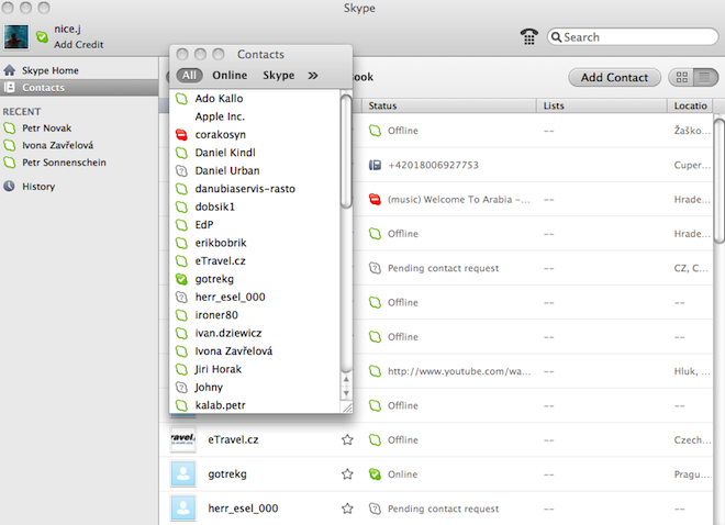 Microsoft vydal novou verzi oblíbeného VoiP programu Skype, který je nyní pro Mac OS X dostupný ve verzi 5.8. Nová verze přináší plnou podporu pro operační systém OS X 10.8 Mountain Lion a množství funkcí, které mají za cíl sjednotit verzi pro Mac s verzí pro Windows. Největší na první pohled viditelnou změnou je přepracované okno kontaktů, které nyní nabízí možnost přistupovat ke svým kontaktům přímo ze samostatného okna. Nemusíte tedy zobrazovat celé okno Skype, ale pokud chcete uskutečnit hovor nebo mít přehled nad tím kdo je aktuálně online, stačí zobrazit pouze okno kontaktů, ke kterému se dostanete pomocí menuBar – Window – Contact Monitor. Další novinkou je možnost sdílet obrazovku skupinám. Tato funkce je dostupná pouze pro prémiové klienty, ovšem stačí když jeden z deseti uživatelů, kteří uskuteční video hovor bude mít prémiové předplatné a mohou všichni sdílet obrazovku.