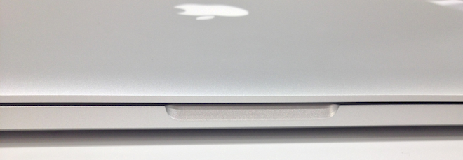 MacBook Pro Retina je pouze o jeden milimetr silnější, než je tloušťka MacBook Air v jeho nejširším bodu a o 6mm tenčí, než běžný MacBook Pro. Pokud by byl počítač pouze tenčí a zůstala by zachována váha ze standardního modelu, působil by pocitově zvláštně, ovšem takto to co vidíte, také zvedáte. To znamená, že jeho tloušťka skvěle koresponduje s váhou. Počítač je skutečně velmi tenký, v podstatě jen o málo větší než USB port. Kombinace váhy a tloušťky je tak skutečně vydařená a pří přenášení budete mít vždy radost, že jste sáhli po Retina modelu. Zajímavostí je také žlábek v přední části počítače, kterým se otevírá víko. Zatím co běžný MacBook Pro má žlábek velmi ostře vykrojený a mnoho uživatelů včetně mě si stěžovalo na nepříjemné odření kůže pokud jste předloktím zavadili o hrany žlábku, u MacBook Pro Retina je vykrojení mírnější a při dotyku nejsou hrany tak ostré, což je příjemné. Apple také odstranil nápis MacBook Pro, který je umístěn pod displejem u všech počítačů MacBook Pro a MacBook Air Unibody, tedy s výjimkou MacBook Pro Retina. Díky tomu, že je MacBook Pro Retina bez SuperDrive mechaniky, přesunul Apple tlačítko pro spuštění počítače na klávesnici, kde nahradilo klávesu eject. Počítači MacBook Pro Retina však chybí ještě jeden detail, který jste pravděpodobně použili poprvé a naposledy když jste počítač poprvé vybalili z obalu. MacBook Pro Retina nedisponuje malým tlačítkem a LED diodami na levém boku, které zobrazují stav baterie.