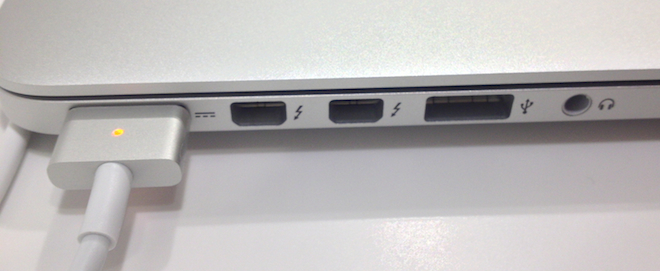 MacBook Pro 15″ Retina je vybaven dvojicí USB 3.0 portů, dvojicí Thunderbolt portů, novým MagSafe 2 portem, 3,5 mm jack konektorem pro připojení sluchátek, HDMI portem a čtečkou SDXC karet. Porty se na rozdíl od běžných modelů nachází dále od sebe, což je sice skvělá zpráva, ovšem díky tomu, že je jeden USB port na levé a druhý na pravé straně je vám to zcela jedno. MagSafe 2 je nejen jiný port než standardní MagSafe, ale nabízí také adaptér, který má koncovku nikoli dozadu, ale do boku. Kabel tedy vyčnívá na bok a ne za MacBook. S tímto kabelem jsme se již mohli setkat u starších počítačů Mac. Na jednu stranu při běžné práci u stolu je nepříjemné, že kabel leží na stole po straně počítače. Ovšem například já si ke velké nelibosti své ženy beru počítač do postele, kde mám zásuvku za sebou a u běžného MacBook Pro se mi kabel neustále odpojuje, to s Retina modelem nehrozí. Apple tak chtěl patrně vyhovět všem, kteří mají zásuvku nejen za počítačem ale také před počítačem, ovšem jistě je procento lidí s MacBook Pro na stole větší než v posteli.