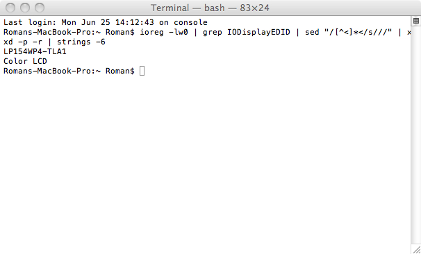 Obecně platí, že pokud zjistíte LCD panel od společnosti LG, je vhodné provést konfiguraci displeje. Pokud zjistíte panel od Samsungu, můžete smaozřejmě displej nakonfigurovat také, ovšem pravděpodobně se nedočkáte až tak výrazné změny. Samozřejmě vša závisí od konkrétního počítače a jeho stáří. Otevřete Terminál (Applications – Utilities – Terminal) a vložte do něj následující příkaz.