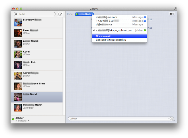 Jakmile budou kontakty načteny, opět si překontrolujeme, zda je u všech uvedeno správné jméno, případně smažeme ty, které již v seznamu nechceme. Skype transport totiž načte i takové, které jsme již kdysi mazali, případně blokovali. Samozřejmě musíte počítat s tím, že tento transport slouží pouze pro chatování a nelze jej využít k volání. Výhodou však je, že umí upozornit, když se Vám právě někdo snaží dovolat a vy pak máte možnost hovor přijmout v nativní aplikaci, která již hlasové přenosy podporuje. Ve finále pak stačí spustit aplikaci Zprávy, a vyplnit Váš Jabber účet, který již bude propojen do ICQ a Skype a vy tak již nebudete nuceni používat aplikace třetích stran, ale pouze čisté řešení od Apple.