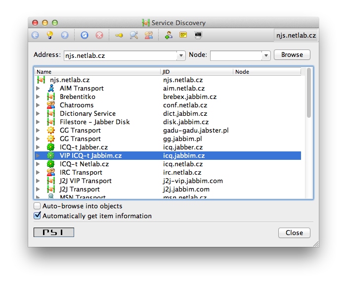 A nyní k samotnému nastavení transportů. Za tímto účelem budeme na chvíli potřebovat aplikaci která jejich nastavení umožňuje. V našem případě použijeme komunikátor PSI. Verzi pro MacOS si můžete stáhnout zde. Aplikaci nainstalujte a v nastavení (modify account) vyplňte Vaše Jabber ID a heslo. Po přihlášení následně z kontextového menu zvolte položku „Service discovery“, kde již nastavíme konkrétní transporty.