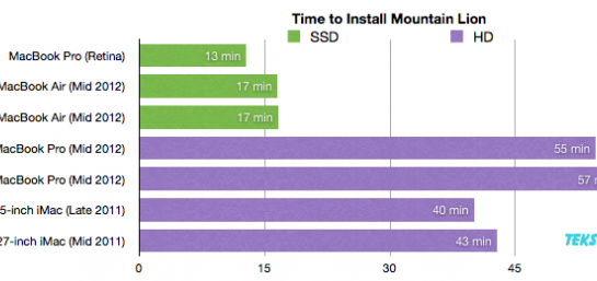 Známy predajca značky Apple v New Yorku s názvom Tekserve, uverejnil zaujímavú tabuľku, v ktorej porovnáva čas inštalácie OS X Mountain Lion na jednotlivých Mac zariadeniach so štandardným pevným diskom a diskom bez pohyblivých častí, takzvaným SSD, ktorý podľa grafu umožňuje viac ako dvojnásobne rýchlejšiu inštaláciu.