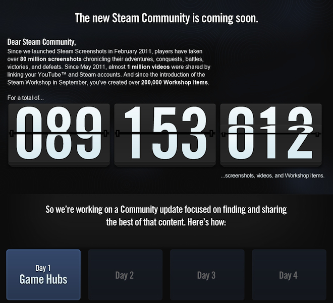 Steam tak sjednocuje komunitu a ze svých více než 40 milionů hráčů vytváří největší herní sociální síť na světě. Hráči tak mají možnost sdílet jednotlivé výtvory mezi ostatní, což povede k ještě rychlejšímu modifikování her. Každá z více než 2000 her na Steamu má navíc svůj vlastní Game Hub, díky čemuž Steam vytváří komunity nejen mezi všemi hráči, ale také mezi příznivci jednotlivých titulů. Již dnes nás čeká další novinka s tím, že se novinek dočkáme ještě ve středu a čtvrtek tento týden. O všech novinkách, které Steam představí vás budeme informovat.