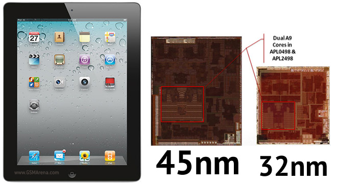Keďže sa jedná len o jednoduchý prechod z 45nm výrobného procesu na 32nm, žiadne zmeny sa v architektúre neudiali, z čoho vyplýva nulový nárast výkonu. Avšak podľa porovnávacích testov zo serveru Andatech, sa pri revízii iPadu druhej generácie viditeľne zväčšila výdrž na batériu. Konkrétne pri surfovaní prostredníctvom Wi-Fi pripojenia,  je výdrž staršieho iPadu 2 10,1 hodín, zatiaľ čo novší iPad 2 vydrží až 11,7 hodín. Pri hraní hier s 3D grafikou, dokáže modernejší výrobný proces predĺžiť životnosť na batérie o 1,78 hodiny a pri prehrávaní videa o 2,4 hodiny. Dôležité je spomenúť, že teplota zariadenia sa v prípade revízie znížila o jeden stupeň. Keďže všetky ostatné súčiastky vrátane batérie, sú pri oboch modeloch identické, slúžia tieto dve verzie iPadu 2 ako skvelý príklad toho, čo dokáže zmeniť menší a hlavne modernejší výrobný proces, pri mobilných zariadeniach a počítačoch.