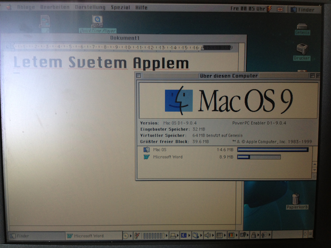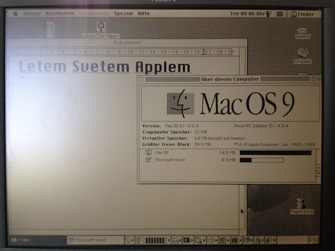 Ponuka aplikácii a ďalších súborov je dostupná v logu Apple, berúc tak na seba podobu klasického Start Menu, aké možno pozná mnoho užívateľov Windows. Na našom notebooku je okrem systémových programov nainštalovaný aj Office 98 Macinosh Edition, ktorý v sebe obsahuje programy Powerpoint, Word, Excel, e-mailový klient Entourage a prakticky v tej dobe nevyhnutný Internet Explorer. Kým pracovné programy sú funkčné, po zadaní adresy v Internet Explorer zamrzne celé zariadenie, pričom ostáva jedine tvrdé vypnutie pomocou vybrania batérie a nabíjačky. Po pripojení nabíjačky sa však Mac automaticky zapne, skontroluje pevný disk a nakoniec načíta systém.