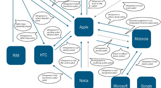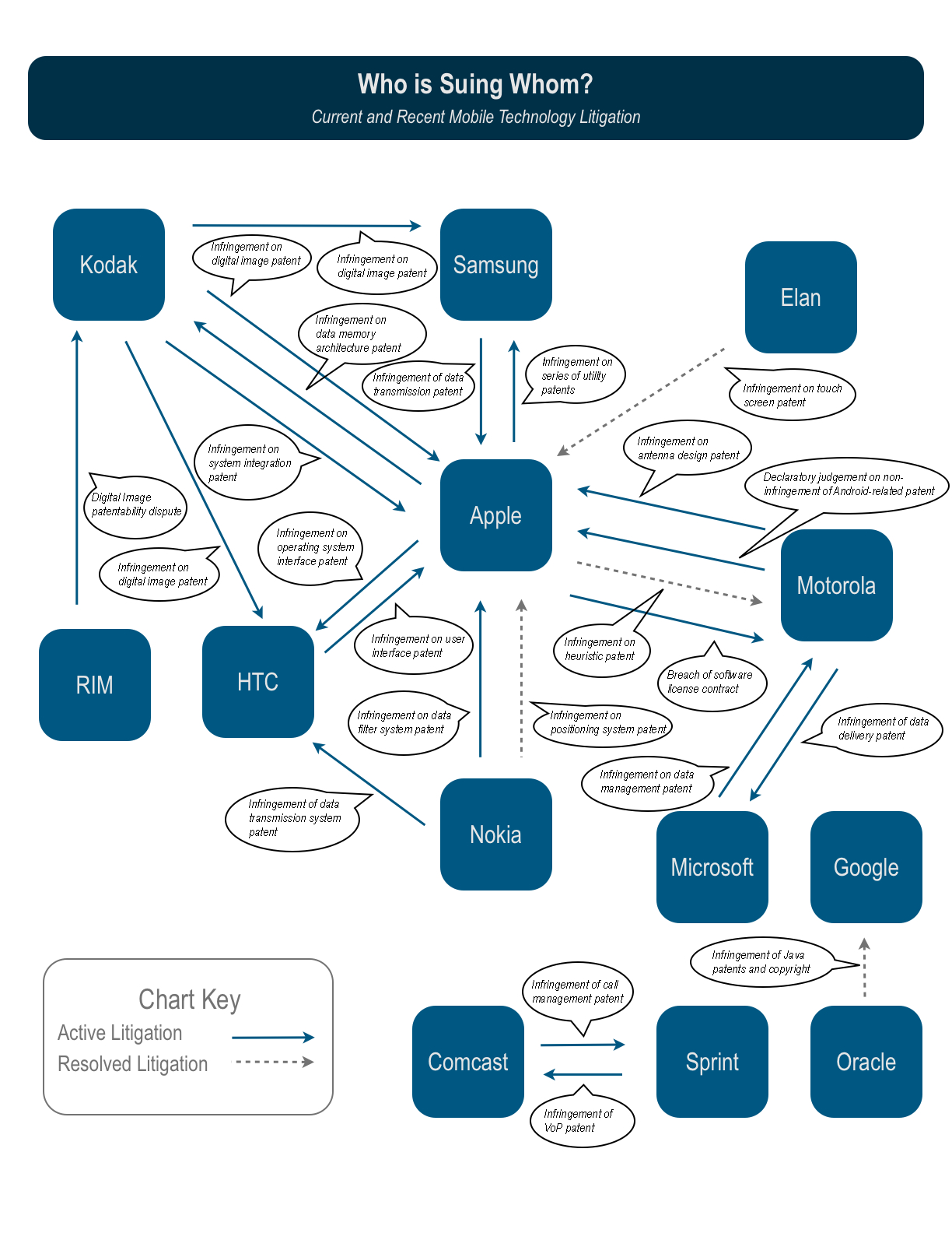 V ostatních případech pak žaluje protistranu na oplátku, protože jej protistran vinní z porušení jejich vlastních patentů. Běžná praxe u těchto nadnárodních korporací je totiž taková, že pokud jedna zažaluje druhou, snaží se protistrana co nejrychleji najít možnost, jak také podat žalobu, aby nakonec došlo k mimosoudnímu vyrovnání, které ve většině případů končí tím, že obě společnosti používají navzájem své patenty. V podstatě jediné dva spory, ve kterých je Apple pouze na straně obžalovaného, jsou spory se společností Nokia a Elan, zdá se tedy, že na tyto dvě korporace Apple nemá žádné eso v rukávu.