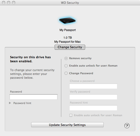 WD Security je aplikace, která slouží k šifrování pevného disku. Jakmile aktivujete WD Security, je váš disk chráněn heslem, bez jehož zadání se k datům nedostanete. Výhodou je, že šifrování není závislé na aplikaci WD Security a pokud disk připojíte k počítači na kterém tento software není nainstalovaný, ochrana vás stejně vyzve k zadání hesla bez instalace software. Heslo si však opravdu musíte zapamatovat, WD jej neukládá na své servery a něco jako vyžádání hesla pomocí mailu není možné. Ochranu je zřejmě možné prolomit jako každou jinou na světě, pokud však najde váš disk i zkušenější uživatel, máte jistotu že se nedostane k datům.