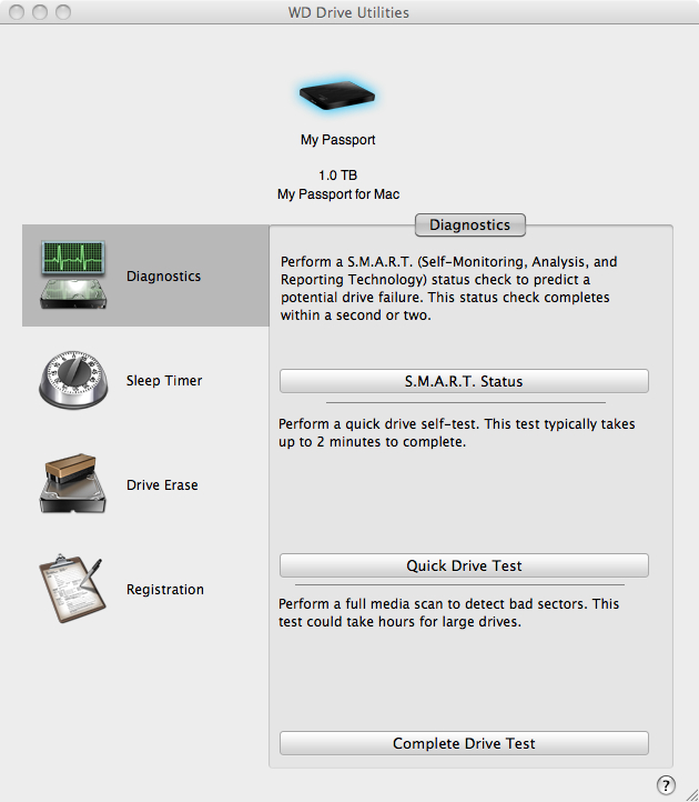 První věcí, kterou musíte po připojení disku udělat je instalace aplikace WD Drive Utilities. Aplikace nabízí několik základních možností, které můžete s diskem provádět. Na výběr je trojice diagnostik disku, jenž vás informují o jeho stavu. Velmi zajímavou možností, která najde uplatnění zejména v momentě, kdy disk používáte neustále připojený k počítači je Sleep Timer, umožňující nastavit uspání disk po určité době nečinnosti. Zkrátka Sleep Timer je to stejně jako uspání v případě Mac OS X. Drive Erase pak skrývá možnosti k formátování disku a v poslední nabídce Registration je možné disk zaregistrovat na stránkách výrobce.
