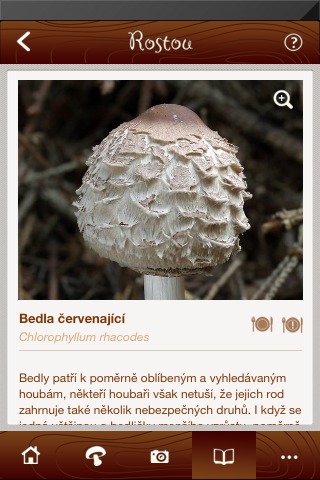 Ďalšou vlastnosťou je fotoaparát. Predstavte si, že nájdete obrovský dubák a máte chuť si ho vyfotiť. Nemusíte sa prepínať medzi aplikáciou a fotoaparátom. Fotoaparát máte totiž vstavaný priamo v aplikácii a umožňuje vám zároveň určit druh huby, pridať k fotke popis a v neposlednom rade máte možnosť zdieľať ju. V neposlednom rade aplikácia obsahuje vstavaný atlas húb, v ktorom nájdete veľké množstvo hríbikov. Po kliknutí na hubu sa zobrazí dlhý a dobre spracovaný popis, ktorému navyše asistujú fotografie danej huby, obsahujúc zároveň možnosť prezrieť si fotku na celej obrazovke. A ak ste si nie istí, čo znamenajú tie výkričníky, príbory a taniere, jednoducho kliknite na otáznik vpravo hore a atlas vystrieda legenda týchto značiek.
