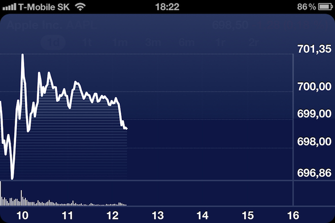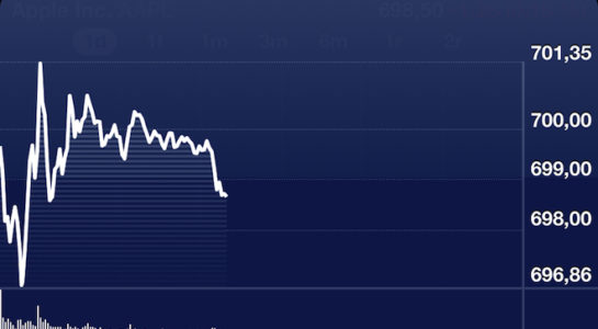 Již včera jsme vási fnormovali a výrazném růstu akcií společnosti Apple Inc. Zatím co se vščera akcie zarazily 20 centů pod 700$, dnes tuto hranici hodnota akcií překonala. Jeden kus akcií se tak prodával během dne až za 701,44$. To znamená, že tržní kapitalizace společnosti je 656 miliard dolarů, zhruba 12,5 bilionů korun.