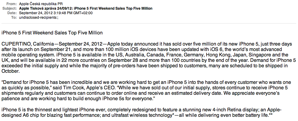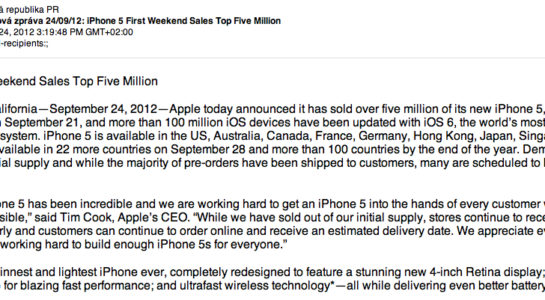 „Poptávka po iPhone 5 byla neuvěřitelná a my se snažíme, aby se iPhone 5 dostal do rukou každého zákazníka, který ho chce tak rychle, jak je to jen možné“ uvedl CEO společnosti Apple Tim Cook v tiskové zprávě, kterou jsme před okamžikem obdrželi. „I když jsme vyprodal naše původní zásoby, i nadále dostáváme zásilky iPhone 5 pravidelně a zákazníci si tak mohou objednat nové přístroje. Vážíme si vaší trpělivosti a tvrdě pracujeme, aby byl dostatek iPhone 5 pro každého,“ dodal Tim Cook. „I když jsme vyprodali dosavadní zdroje, obchody i nadále přijímají objednávky a informují o předpokládaném datu dodání,“ dodal.