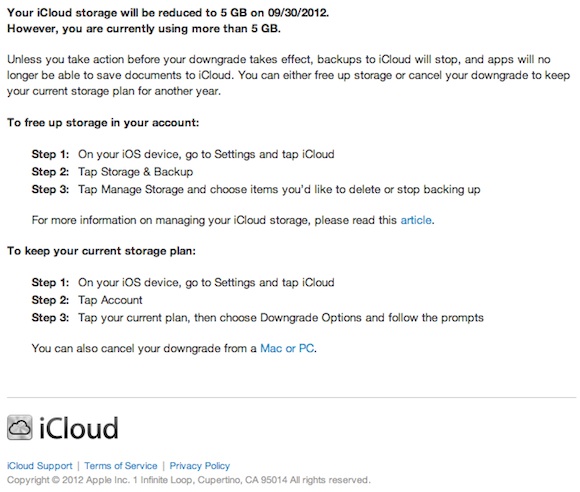 Toto bonusové miesto však malo platnosť len po dobu jeden rok a práve v dnešných dňoch Apple rozposlal týmto užívateľom e-maily informujúce o tom, že ich voľné miesto na internetovom úložisku bude znížené na 5GB. Zníženie kapacity prebehne súčasne s ukončením sociálnej siete iTunes Ping, 30. septembra 2012. Ak patríte medzi užívateľov, ktorí dostali upozornenie, alebo vedome vedia o tom, že využívajú viac, ako 5GB miesta, môžete si predplatiť jeden z troch prídavných balíčkov, presnejšie 10GB za 16€ na rok, 20GB za 32€ ročne a až 50GB za 80€ na rok. Voľné miesto si môžete zakúpiť aj cez váš iPhone, iPod či iPad, stačí mať iTunes účet s aktívnou transakčnou službou.