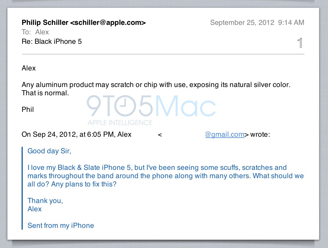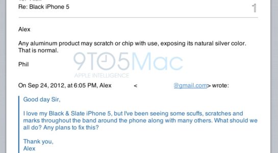 Čtenář serveru 9to5mac.com napsal přímo SVP společnosti Apple Phillu Schillerovi dotaz, týkající se poškrábání iPhone 5. Senior Vice President pro celosvětový marketing společnosti Apple Inc. Phill Schiller dostal dotaz, ve kterém čtenář jménem Alex nejprve ocenil vzhled nového černého iPhone 5, ale zároveň také dodal, že jej trápí škrábance a oděrky, které zadní část iPhone 5 utrpěla. Schillera se ptá, co se s tím dá dělat a zda Apple má nějaké řešení jak vyřešit tento problém, který jak jsme již uvedli trápí značné množství uživatelů iPhone 5.