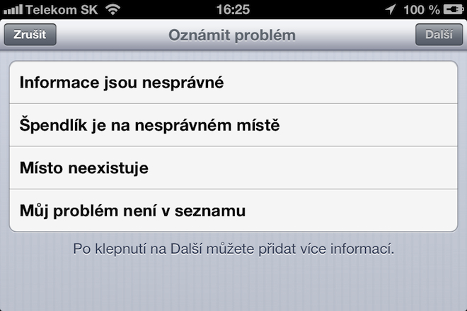 Pod možností oznámit problém se nabízí několik možností: Informace jsou nesprávné, Špendlík je na nesprávném místě, Místo neexistuje a nebo Můj problém není v seznamu. Jakmile vyberete problém a vyplníte formulář, stačí zvolit možnost odeslat. Informace se dostanou na servery Apple, které je vyhodnotí a předají vývojářům. Díky těmto informacím může Apple zdokonalovat mapy a uživatelé budou jistě spokojeni.